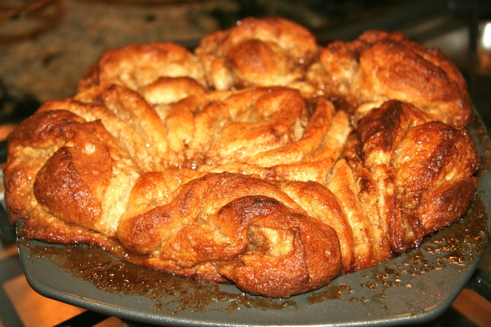 Pour onto the rolls while still warm, saving a little. After the rolls have absorbed some of the icing, pour on the rest (or I like to do this to each on the individual plates).