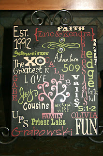 I bought some blank canvases at the craft store and painted them black and brown. My husband and I brainstormed words that describe each family and their history and life. I then used my Sillouette machine to cut out vinyl words for each canvas. I mailed one of them before I could take a picture, but here are the other two.