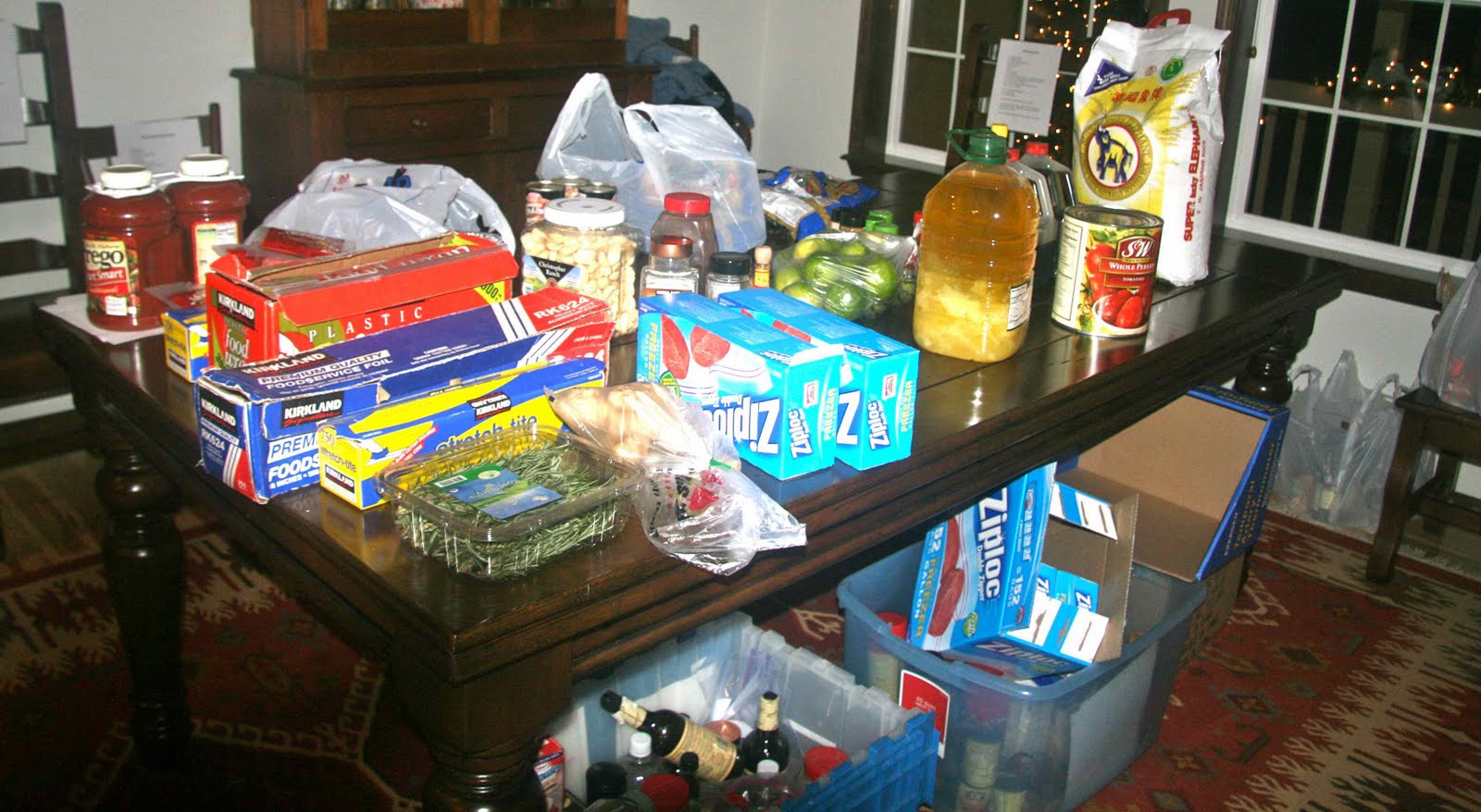 3. Pick a place in your house where you can organize all of the ingredients. For me, I use our dining room. I tape each recipe to the wall or to a chair, then I place the ingredients that go with that meal underneath the recipe. Common ingredients like olive oil, onions, salt, garlic, vinegar, etc. go on the middle table for all to use.